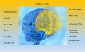 The Prefrontal Cortex (PFC) is the CEO of the brain. Below is a diagram of the prefrontal cortex and the functions it controls. These are known as the Executive Functions because they are responsible for the management of our daily lives.